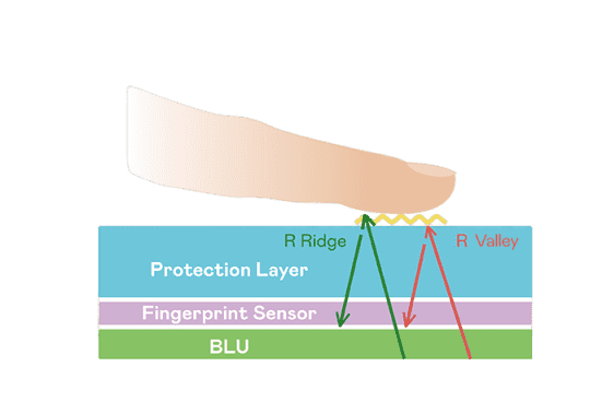 TFT 指纹扫描感测技术利用薄膜电晶体 (TFT) 当作光感测元件,,,藉由非晶硅 (a-Si) 与低温多晶硅(LTPS)既有光电转换特性对不同波段光源进行吸收,,,,使感测 IC 读取阵列感测元件的光漏电差异,,,转换成数位灰阶影像。。